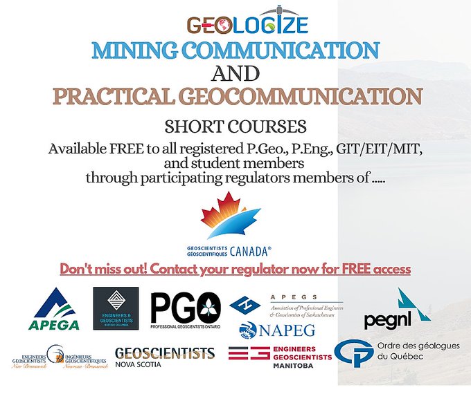 Free Professional Development Opportunity-Mining Communication and Practical Geocommunication short courses by Geologize are now available for registered professionals through participating members regulators of Geoscientists Canada.