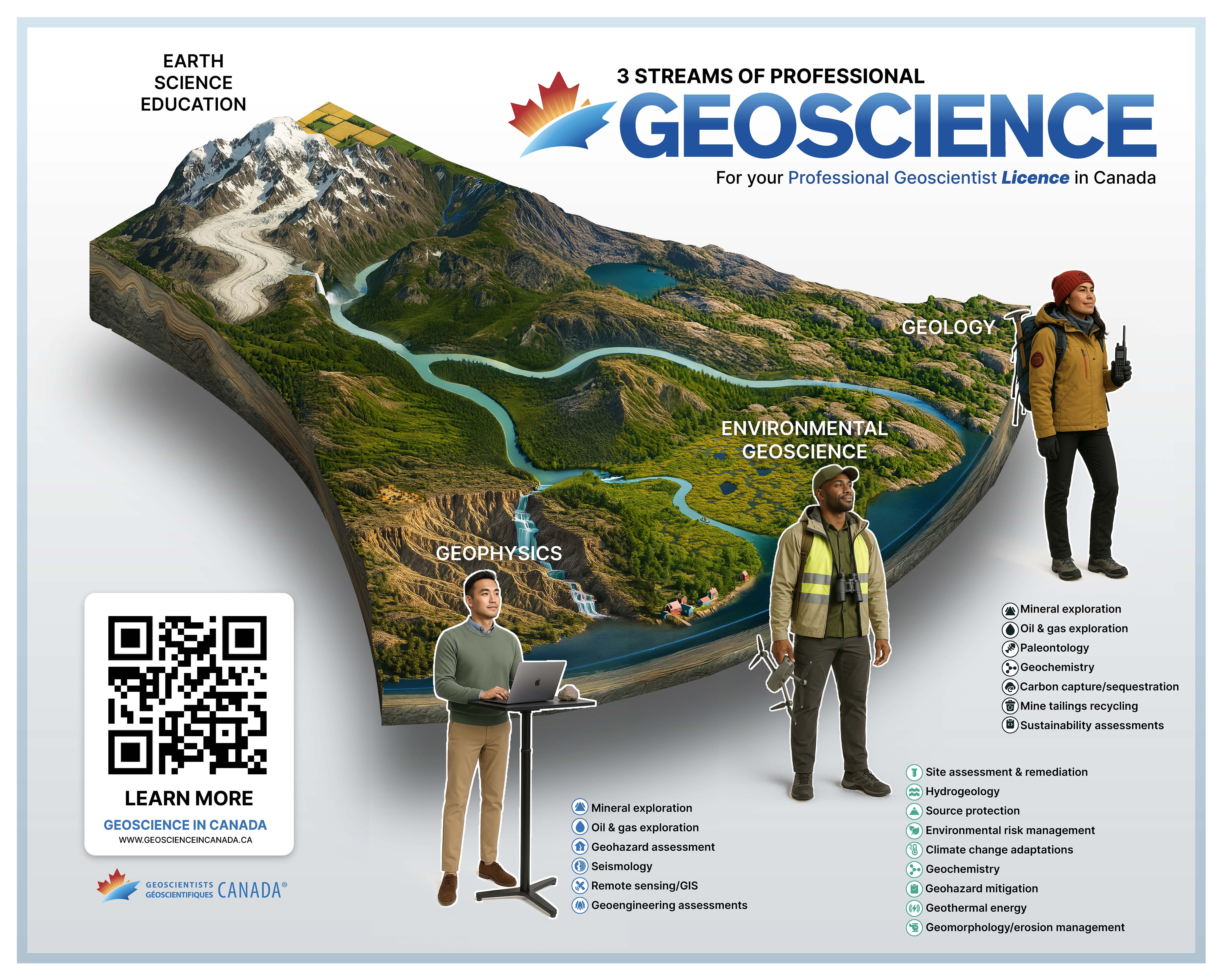 Geoscientists Canada is the national organization of the provincial and territorial regulatory bodies that govern Canada’s professional geoscientists and geoscientists-in-training. Geoscientists Canada co-ordinates development of high national standards of admissions, competency, practice and mobility to ensure that Canada is served by a skilled, versatile, reputable and accountable geoscience profession. Learn more here.